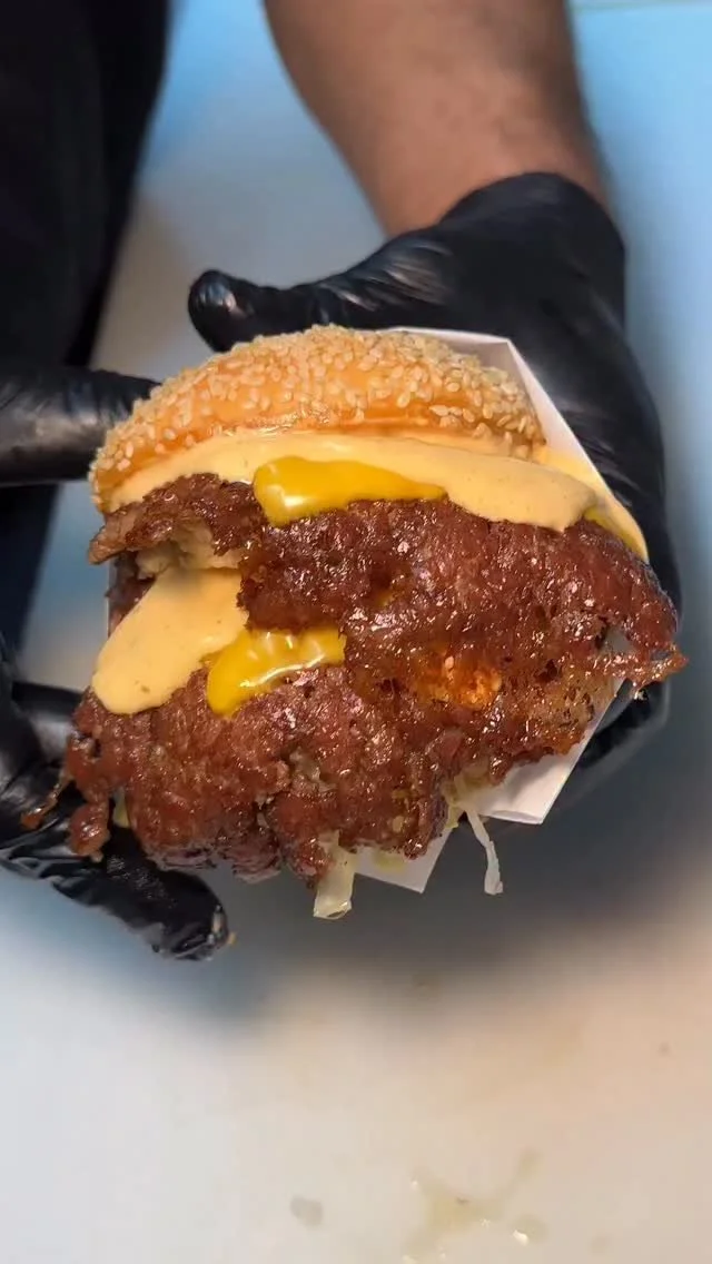 Double Impossible Patties, Double Vegan Cheese, Shredded Lettuce, Pickles, Raw Onions, SMASHED Sauce on a Triple Vegan Sesame Bun.